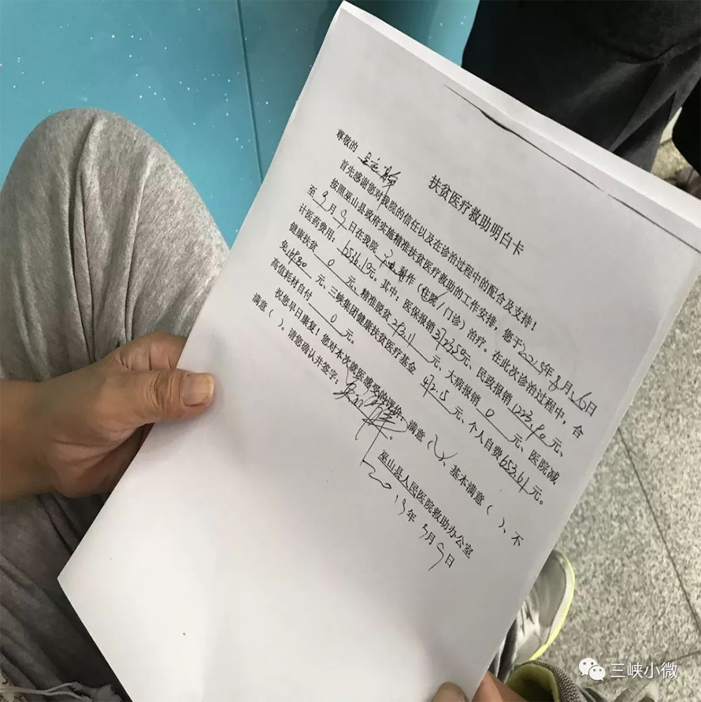 原來,在巫山、奉節,貧困患者完成“一站式”結算時,會在“扶貧醫療救助明白卡”或者收據單據上發現一欄“三峽集團健康扶貧醫療基金”/“三峽集團(縣級)醫療救助”。這是三峽集團為建檔立卡貧困人口提供的“兜底”保障。建檔立卡貧困人口到縣內定點醫療機構住院就醫產生的醫療費用,通過‘五重保障’減免報銷后,如果還有超過總費用10%的錢需要繳納,超出的部分就由三峽集團提供的基金金兜底救助,確保患者自付比例控制在總費用的10%以內,大大減輕了貧困患者的經濟負擔。