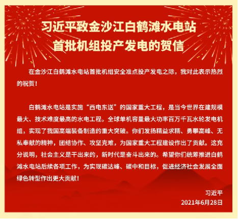 習(xí)近平致信祝賀金沙江白鶴灘水電站首批機(jī)組投產(chǎn)發(fā)電