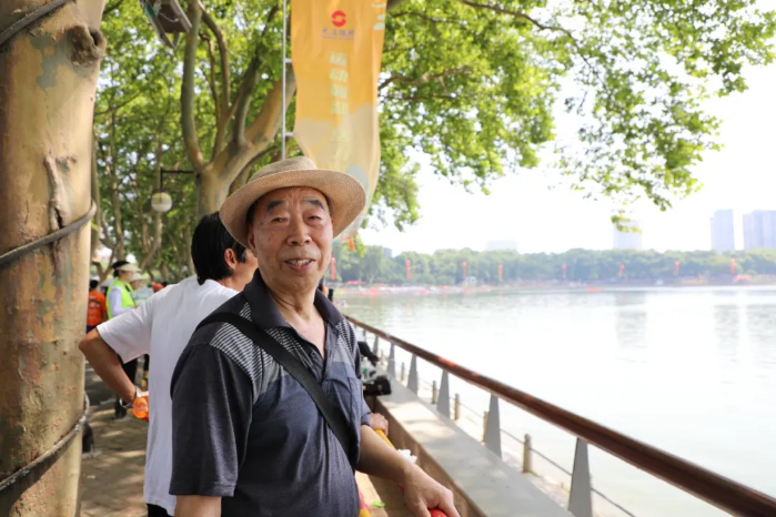 ▲ 鄒強(qiáng)明正在南門湖畔看龍舟比賽。攝影:何玲