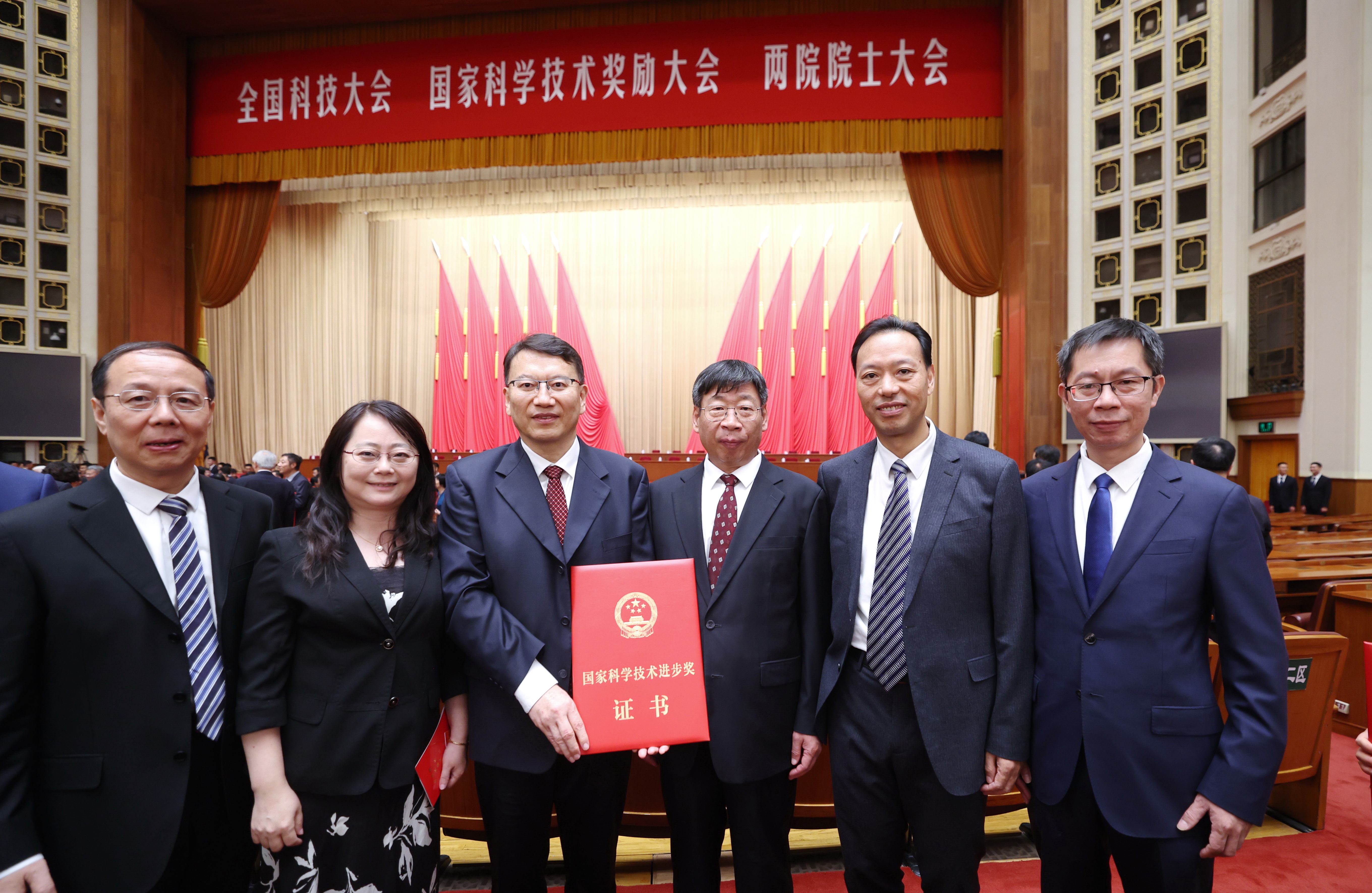 ▲項目獲獎代表在人民大會堂領獎后合影(新華社記者 鞠鵬攝)